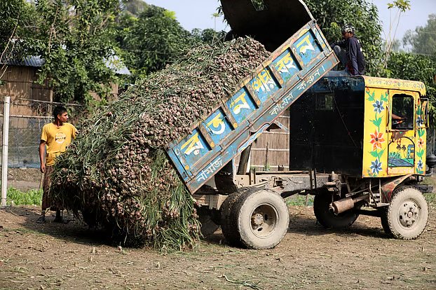 মাঠ থেকে তোলা পেঁয়াজ স্থানীয় ভটভটি ও ট্রাকে করে নিয়ে আসা হচ্ছে পাইকারি বাজারে। বাজারের চিত্রটি আরও চমকপ্রদ। দেখা গেছে, পাহাড়ের মতো উঁচু করে স্তূপ করে রাখা হয়েছে সদ্য তোলা লাল টকটকে পেঁয়াজ। এই বিশাল কর্মযজ্ঞ সামলাতে নাভিশ্বাস উঠছে শ্রমিকদের, তবে ফসলের প্রাচুর্য তাদের সেই ক্লান্তি ভুলিয়ে দিচ্ছে।